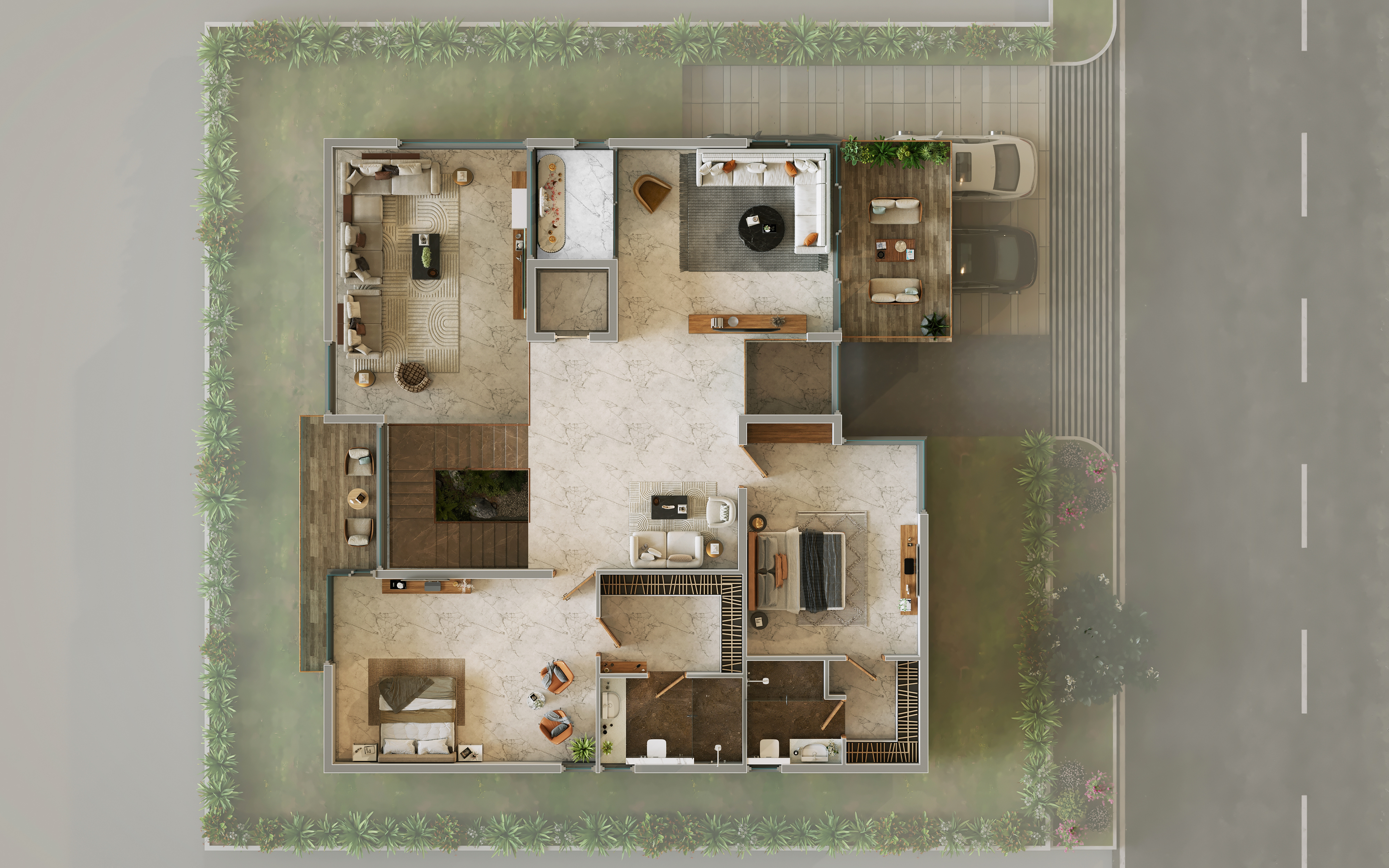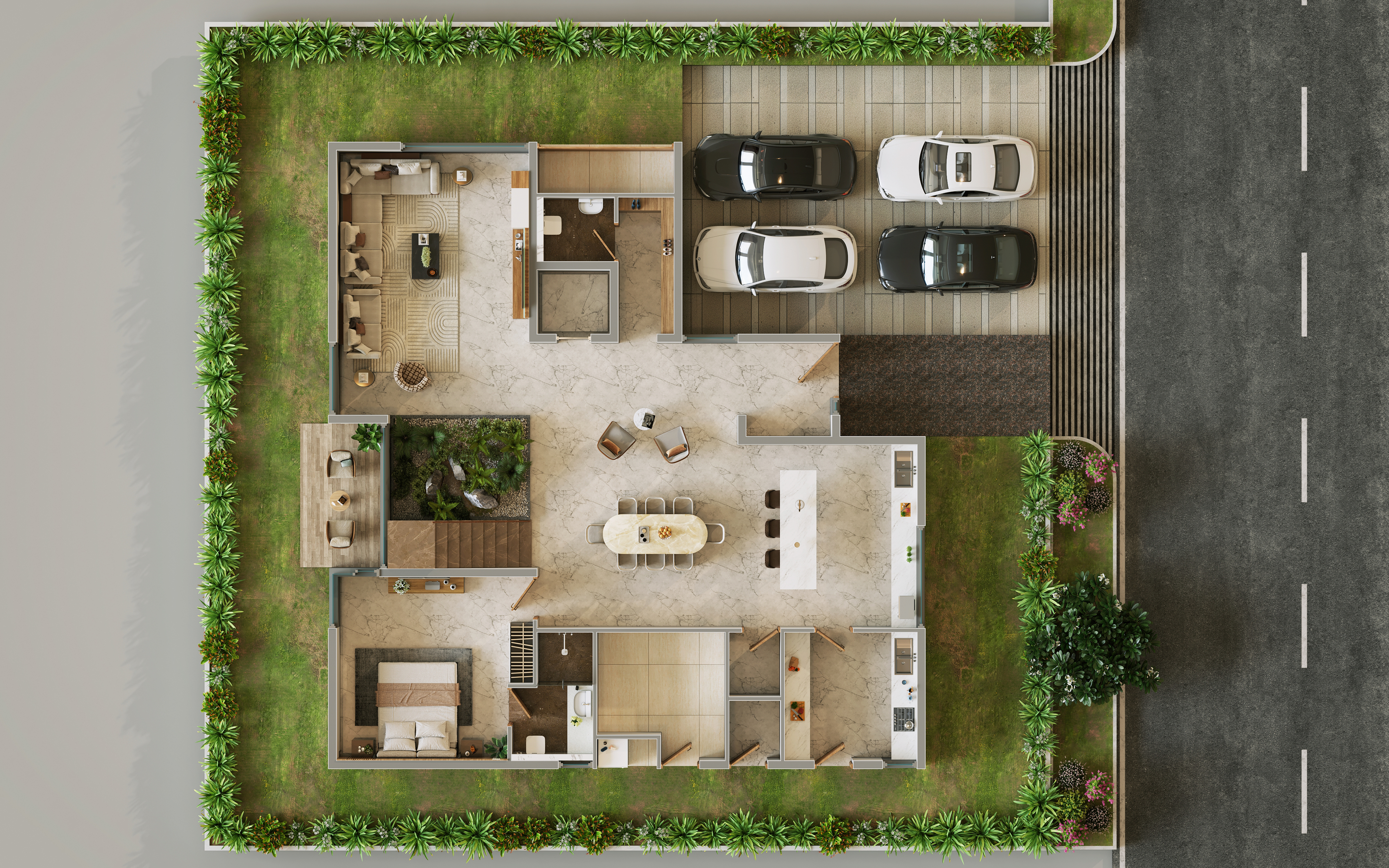 A rendered floor plan is a scaled 2D or 3D view of a home's layout, including rooms and furniture.